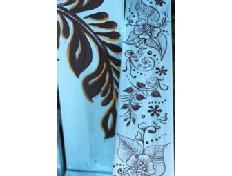 Jeffrey's chair is beautifully decorated with traditional henna designs from India. To admire this chair up close, please visit Philbrick's Fresh Market at 775 Lafayette Rd. Route 1 Portsmouth, NH
