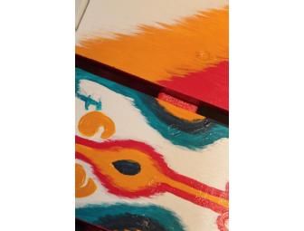 This chair represents a new interest of Karen’s, Uzbekistani Ikat textiles. She appreciates the imperfections often found in these handmade textiles as she does not use stencils, tracing paper, or other devices in her own artwork. All Karen’s pieces are drawn and painted by eye and a steady hand. To admire Karen's chair up-close, please visit Blue Moon Evolution at 8 Clifford St. in Exeter, NH.