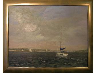 "Coming Home", an oil painting by Bev Klucher, depicts heading up the narrows of Cotuit Bay in a sailboat. Measures approximately 32" x 26" in a gold frame.
