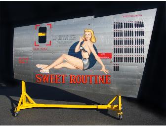 This incredible, full sized authentic replica of the B-24 hull section of Sweet Routine can be yours. The finished panel with nose art painted by renowned aviation artist Gary Velasco, features actual stringers and formers, working fire extinguisher door, and acrylic plexiglass window. Ready to hang on a wall. Size of piece is 11.5 feet wide by 7.6 feet tall. Display stand is optional and not included. Will be crated and truck freighted to winner.