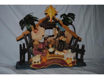 This wood with metal nativity decor also plays music and the people move when the music is playing. Great holiday decor.