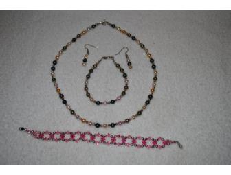 3 Piece set of glass swarski pearls and bead set with necklace, bracelet and earringsl along with pink bracelet.