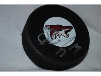 Coyotes Hockey Package includes a Shane Doan #19 autographed hockey puck, Derek Morris #53 Autographed photo; Joseph Curtis bobbing figurine and Decade in the Desert alarm clock dated 1996 to 2006.