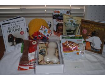 Basket includes Basset Hound book and Happy Adopted Dog book; Galileo Nylabone for powerful chewers; healthy living plus pumpkin dog chews made with chicken; dura chew, nutri-dent, duratoy, healthy edibles.