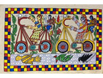 Featured on handmade Nepali lokta (daphne) paper this vivid painting is born from the traditional painting of lively designs by Maithili women on the walls of their homes in honor of festivals and wedding rituals. Created in conjunction with The Janakpur Women's Development Center, this painting and the others in this series, were used as a vehicle for the empowerment of Maithili women in Nepal by blending art and tradition. The JWDC is the first NGO in Nepal to use traditional painting as a means to empower women and provides training in literacy, management, leadership, gender awareness and basic business skills.