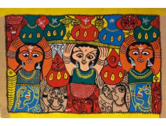 Featured on handmade Nepali lokta (daphne) paper this colorful painting is born from the traditional painting of lively designs by Maithili women on the walls of their homes in honor of festivals and wedding rituals. Created in conjunction with The Janakpur Women's Development Center, this painting and the others in this series, were used as a vehicle for the empowerment of Maithili women in Nepal by blending art and tradition. The JWDC is the first NGO in Nepal to use traditional painting as a means to empower women and provides training in literacy, management, leadership, gender awareness and basic business skills.