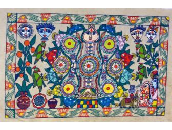 Featured on handmade Nepali lokta (daphne) paper this vivid painting is born from the traditional painting of lively designs by Maithili women on the walls of their homes in honor of festivals and wedding rituals. Created in conjunction with The Janakpur Women's Development Center, this painting and the others in this series, were used as a vehicle for the empowerment of Maithili women in Nepal by blending art and tradition. The JWDC is the first NGO in Nepal to use traditional painting as a means to empower women and provides training in literacy, management, leadership, gender awareness and basic business skills.