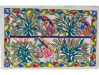 Featured on handmade Nepali lokta (daphne) paper this vivid painting is born from the traditional painting of lively designs by Maithili women on the walls of their homes in honor of festivals and wedding rituals. Created in conjunction with The Janakpur Women's Development Center, this painting and the others in this series, were used as a vehicle for the empowerment of Maithili women in Nepal by blending art and tradition. The JWDC is the first NGO in Nepal to use traditional painting as a means to empower women and provides training in literacy, management, leadership, gender awareness and basic business skills.