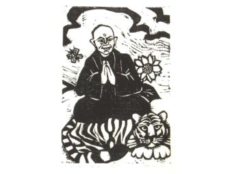 This original, hand-pulled linocut of Thich Nhat Hanh, with tiger, lotus, and butterfly detail was created by Sandy Eastok. It is one of a series of linocuts made by her to commemorate 26 great beings from the Buddhist, Celtic, and Native American traditions.