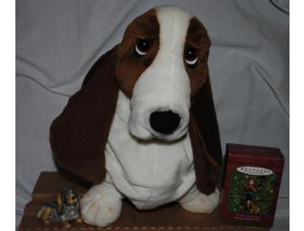 Basset Hound hand-carved figurine from Turkey 1998, Caroler's Best Friend Hallmark Keepsake ornament and large plush Hush Puppies Basset Hound.