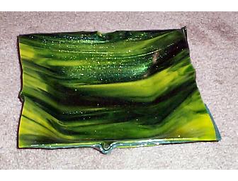 This bowl was developed through a process of glass fusing and slumping. This one of a kind piece is formed by a partial fuse to allow for defined edges on the glass. Approximately 9 1/2" by 9 1/2".