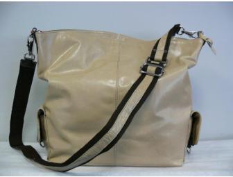 Large, natural colored, all leather handbag with 2 shoulder straps, two outside pockets, two inside pockets, and lots of room for your "stuff".