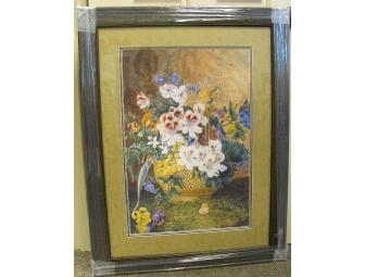 Add to the beauty of your home with this colorful floral print. At 32" X 42", it's large enough to be a focal point of any room. The print is beautifully framed in a basketweave design to match the basket in the print and it is double-matted.