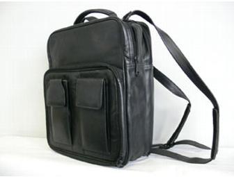 Black leather laptop backpack with plenty of compartments to store your laptop accessories, pens, paper etc.