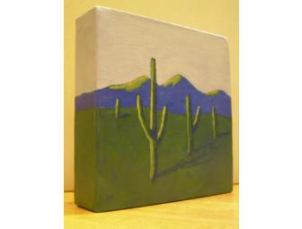 This Sonoran Desert scene depicts the Saguaro cacti typically seen in the area. It is painted in acrylic paints on a 6x6 inch gallery-style canvas. It is actually capable of free-standing on its own as seen in the photo. It was painted on August 2011 specifically for this event. Donor: boran2/Howard Fields