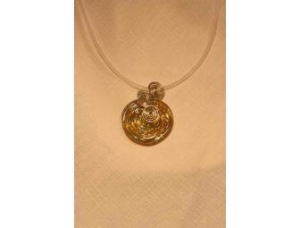 Lampworking glass disc embellished with sterling silver, opalescent colored glass hue picks up the colors of it's surroundings. Created by Westerville, Ohio artist Wendy Emery. Pendant is 1.25" diameter on an adjustable illusion rubber necklace that will adjust from 17 to 20".