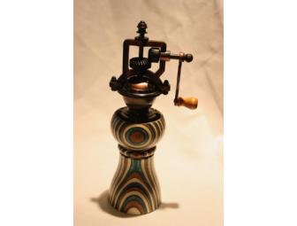 Barbara Crockett's dyed domestic woods pepper grinder is a wonderful addition to any kitchen. Her care in selecting woods and turning them is appreciated by local cooks who swear by the grinder.