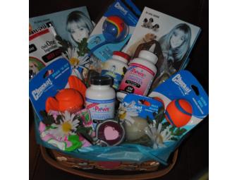 This awesome PAAWS Basket contains lots of amazing products for your pet including: Dr. Carol's Naturally Healthy Dog Book, Dr. Carol's Naturally Healthy Cat Book, PAAWS Vitamins (1 bottle of AM and PM formulas), Hip and Joint Supplement, Glow in the Dark Ball, Breath-a-licious Dental Chew Bones, Macho Bully Organic Beef Chew Stick, Chuck-It Rocket Ball Launcher, Chuck-It Wheelie Dog Toy, Chuck-It Drag N Fly Toy, Ultra Ball (2), Prime Taste Real Beef Liver Treats, Flower Power Second Skin Dog Apparel, Beautiful Basket (Reusable for piling up all your pet's favorite toys!).
