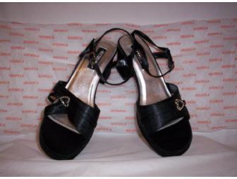 Brand New Andrela Black Satin chunk heel sandal with a decorative silver heart to add that touch of love. An attractive and comfortable shoe for work or play. available in size 8 and 10.