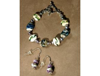 Swirls of blue, green, purple and ivory blend together to create the colors of a stormy surf. Clear crystals and colored beads add beauty to this 7 inch long bracelet. Matching earrings are included with this breathtaking jewelry set. The essence of Deb Rich's artistic expression is revealed in each lampwork bead that she creates in her studio. Deb's beads exhibit her desire to create and inspire change through community outreach. These jewelry pieces are offered exclusively through cMarket to support the fundraising efforts of non-profit organizations. Lampwork glass reflects both the heartfelt passion and interpretative expression of Deb Rich. Her artistic resume includes fantasy sculptures, creatively fashioned from found-objects and recycled materials. Deb's Glass Designs are truly hypnotic, one-of-a-kind pieces that cannot be replicated or manufactured by a machine. Deb only sells jewelry pieces that capture the grace and flow of glass artistry. All jewelry is made with sterling silver or copper findings, Czech or Swarovski Crystals, and various complementary beads, making Deb's Glass Designs positively the best choice.