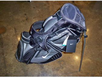 Black/gray stylish golf club carrying bag. Multiple compartments and 8 club organizer areas. Donated by Kelly Trent of the Raymond Memorial Golf Course in Columbus, Ohio.