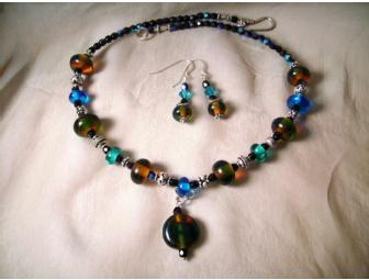A subtle blend of amber, teal and aqua lampwork glass beads is hi-lighted with black Czech AB crystals and bali silver. This 17" necklace is meant to be worn short so that the peacock dangle rests near the clavicle. This gorgeous necklace comes with matching earrings.
