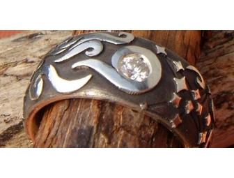 The ring's unisex design features a dramatic black background reminiscent of the vast night sky. Precious and semi-precious three millimeter gemstones are the centerpiece of this solid sterling silver ring, crafted by hand with recycled metal. The successful bidder will choose from either diamond or sapphire.