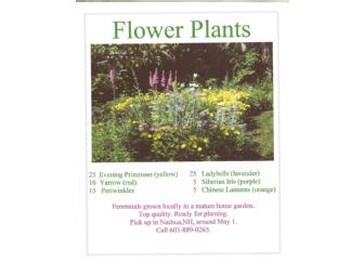 Top quality, ready for planting, 85 perennial flower plants in six varieties grown locally in a mature home garden. Includes: 25 Evening Primroses (yellow), 10 Yarrow (red), 15 Periwinkles, 25 Ladybells (lavender), 5 Siberian Iris (purple), 5 Chinese Lanterns (orange).