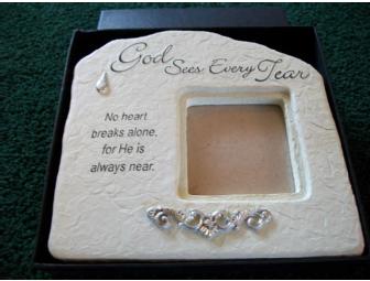 Abbey Press picture frame (new in box), 2008, made of resin to resemble real stone, measures approximately 6" high by 6" wide.