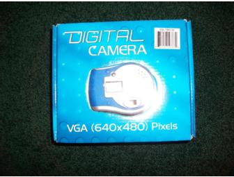A dual function digital camera (new in box) with 300k pixels (640x480) resolution, and 64 Mbits SDRAM memory. Includes camera strap, driver CD, USB cable and instruction manual.