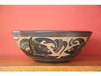 Pottery with indigenous designs. Made in the potters' village of San Juan de Oriente. Signed by the potter. Measures 11" in diameter and 4.5" tall.