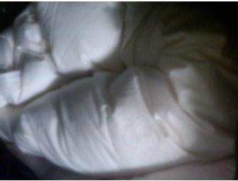 A queen size mattress feather pad made with 91% waterfowl white feathers and 9% white down. Was used only 2 times on bed - in great condition!