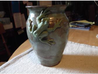 6 1/2 inch tall stoneware vase, hand thrown glazed with green stone with matte lime green frog near mouth. Fired cone 6.