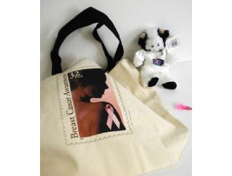 U.S. Postal Service Breast Cancer Awareness Stamp 1996 tote bag with soft stuffed animal.