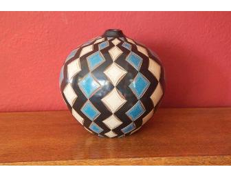 Pottery with indigenous designs. Made in the potters' village of San Juan de Oriente. Signed by the potter. Measures 8.5" in diameter and 8.5" tall.