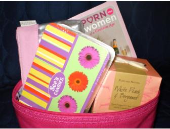 Includes a gift pack of Crabtree and Evelyn products, a box of See's Candy, a Pure & Natural White Peach and Bergamont candle and some good reading "Porn for Women of a Certain Age" - all in a pink fauxl leather make-up case!