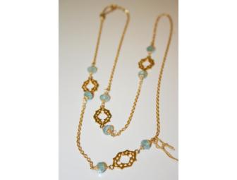Long 22K Gold vermeil chain with blue quartz stones and 22k Gold vermeil filligree charms.