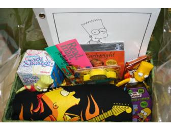 Nancy Cartwright signed production script, 2 packs of Simpson bubble gum and stickers, 1 8x10 signed poster, 1 mini signed "Read, Man" card, 1 Bust-Ups micro model kit, 2 Simpson figurines, 1 T-shirt, 1 Kidrobot collectible art, "My Life As A 10 Year Old Boy" 5 CDs, and 1 antenna topper.