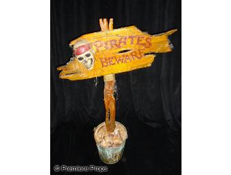 Pirates of the Caribbean: The Curse of the Black Pearl (2003) - A custom made "Pirates Beware" sign created by the art department at Disney for the film's premiere. Includes a three dimensional skull and cement filled decorated bucket. 36" x 44" x 13" . Oversized item. Additional shipping charges required.