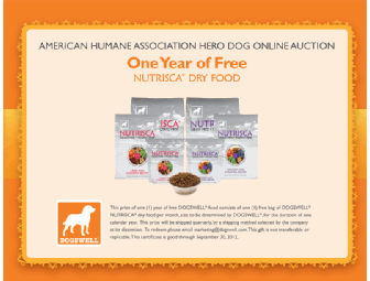 Free year of food for one dog. Quantities to be determined based on breed and age of winning pet. Maximum amount of 15 bags. Redeemable quarterly by emailing Dogswell (contact provided to Auction Winner). Offer expires September 30, 2012.