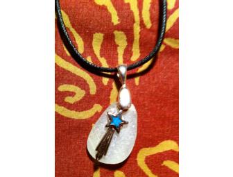 A tourquoise inlayed Shooting Star Charm mounted on a beautiful piece of Monterey Bay Sea Glass. A unique piece suspended on an ajdustable cotton cord.