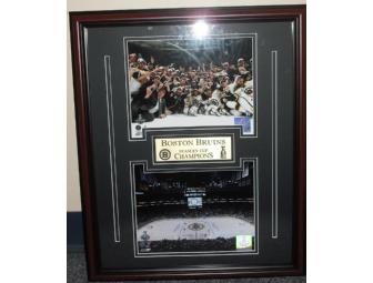 Framed Boston Burins Stanley Cup Champions Collage with team photo and photo of game 7 in play.