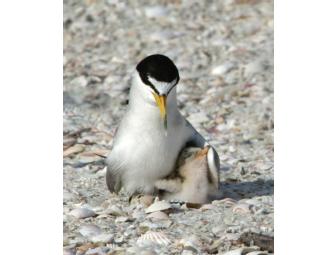 Photo of a Least Tern parent with chick by Joan Miller. White mat with black frame under plexiglass. Framed size is 18" wide x 20" high.
