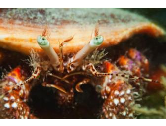 Photo of starry-eyed hermit crab by Jimmy White. White mat with black frame under plexiglass. Framed size is 25" wide x 20" high.