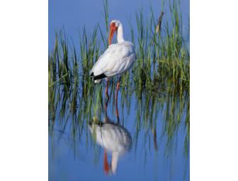 Photo of White Ibis preening feathers by Joe Bailey. White mat with black frame under plexiglass. Framed size is18" wide x 23" high.