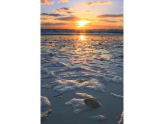 Photo of sunray venus shell on beach at sunset by Janessa Cobb. White mat with black frame under plexiglass. Framed size is 16" wide x 20" high.