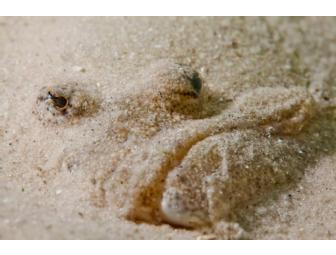 Underwater photo of flounder nearly concealed in sand. White mat with black frame under plexiglass. Framed size is 25" wide x 20" high.