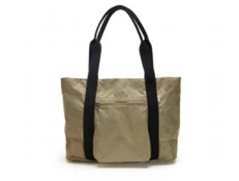 Great tote bag made of 100% water resistant nylon from Onia. This is the perfect beach or gym bag. The interior is lined with a matte black tarpaulin nylon. Bag has top zipper, front pocket with zipper and cotton webbing handles.