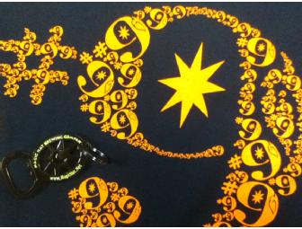 A fancy dark blue shirt with Magic Hat written across the chest and, get this, #9 written completely in 9s on the back in orange. These shirts cannot be purchased in our store! There's also a sweet keychain bottle opener that's chromed out and ready to look super spiff next to all your keys!