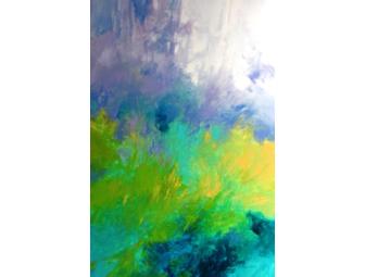 "Spring Green Sounds" is an original oil on linen by Bonnie Acker. Breath-taking blues, purples, and yellows will illuminate any room. Painting measures 20"w x 30"h and is unframed.